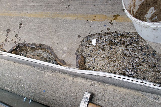 Danach wird das Material zum Verschließen der für die Sanierung vorbereiteten Ausbruchstellen und zur Reprofilierung der Betonfläche eingebracht. Abschließend werden auch die Fugenbereiche reprofiliert und wieder hergestellt.