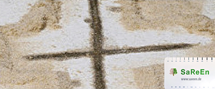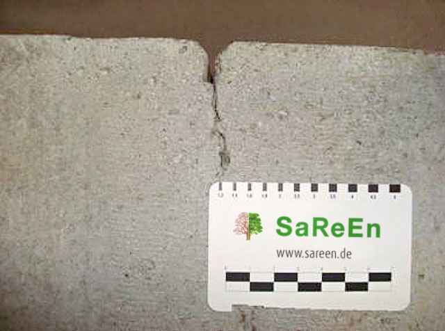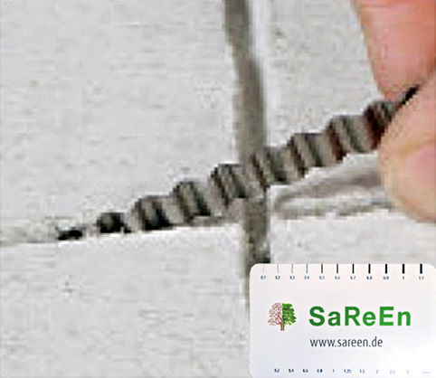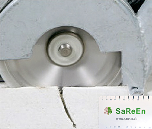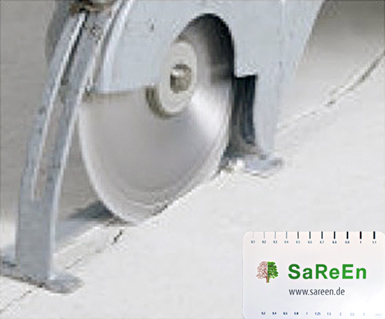 Leistungsumfang: An waagerechten Flächen, nach Untergrundvorbereitung vorhandene Risse (> 0,4 mm) werden mit einem Trennschleifer auf mindestens 6 mm aufgeweitet. Rechtwinklig zu den aufgeweiteten Rissen werden breite Querfugen von mindestens 9 mm Breite eingeschnitten und entsprechende Lamellen zum kraftschlüssigen Verbund eingearbeitet.